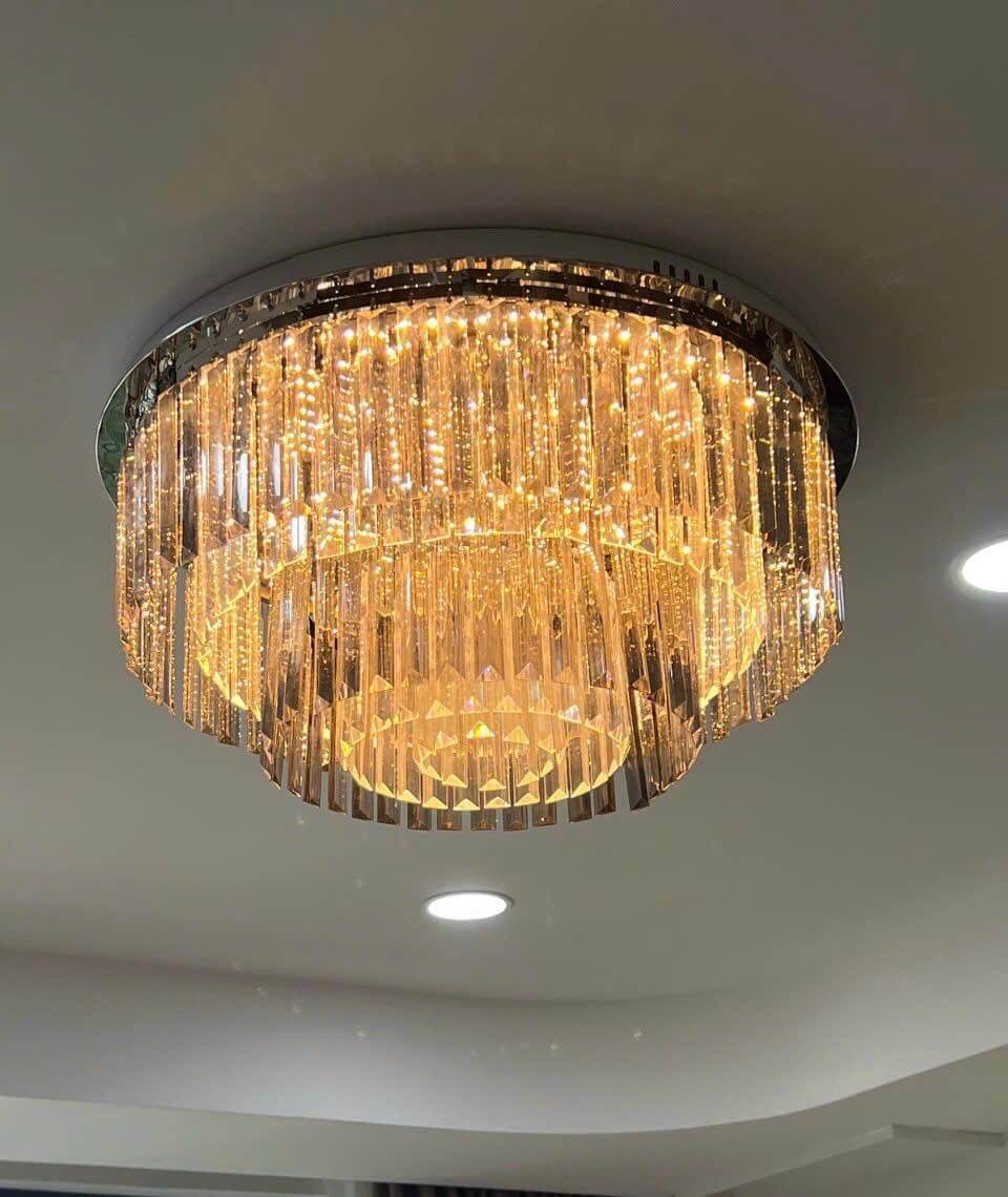 - Phòng khách: Đèn ốp pha lê thường được lắp đặt trên trần phòng khách, giúp không gian trở nên sang trọng và lung linh. Ánh sáng phản chiếu từ pha lê tạo ra không gian ấm cúng và cuốn hút.