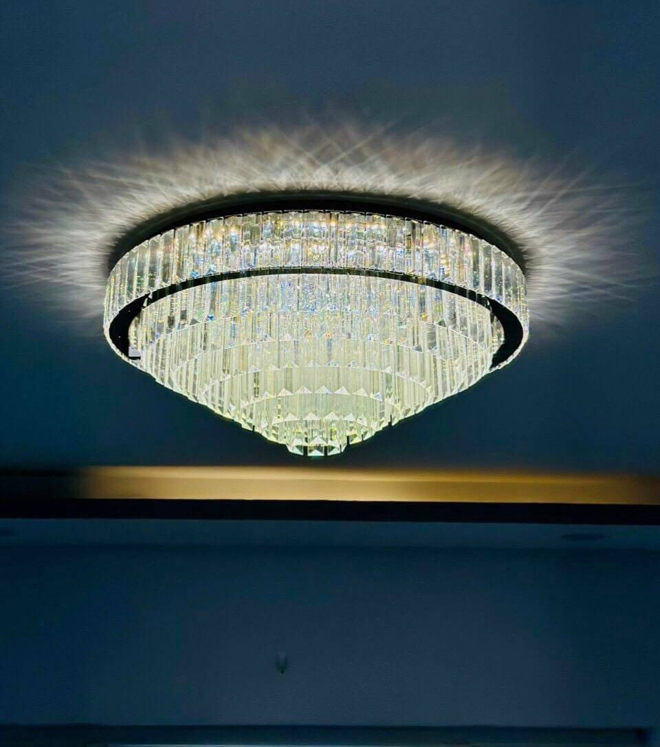 • Phòng khách: Đèn ốp pha lê thường được lắp đặt trên trần phòng khách, giúp không gian trở nên sang trọng và lung linh. Ánh sáng phản chiếu từ pha lê tạo ra không gian ấm cúng và cuốn hút.