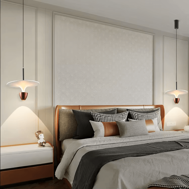 - Phòng ngủ: Đèn thả Bắc Âu có thể được sử dụng làm đèn đầu giường, treo hai bên giường ngủ để thay thế cho đèn bàn truyền thống, giúp tiết kiệm không gian và tạo nên sự mới lạ.